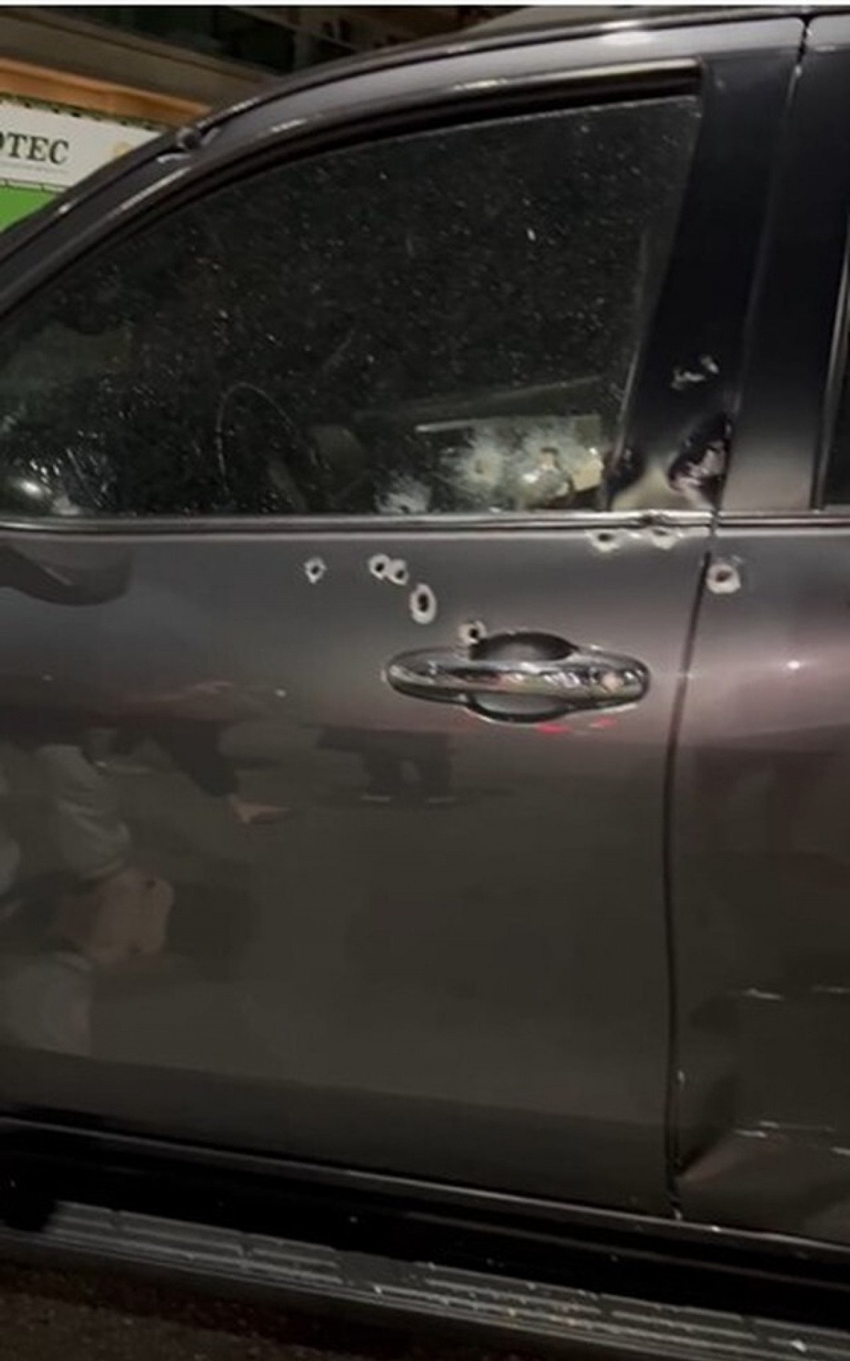 Imagens mostram o carro cravejado de tiros, principalmente na altura do vidro e da porta do motorista. É possível ver ao menos 15 perfurações na lataria do veículo.