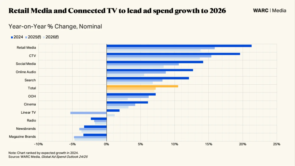 As novas projeções também mostraram que as empresas exclusivamente online devem registrar um aumento de 14% na receita publicitária, chegando a US$ 735,7 bilhões. Já a mídia de varejo, mídia social e CTV devem liderar o crescimento digital de 2025 a 2026, correspondendo a mais de 85% dos investimentos online.
